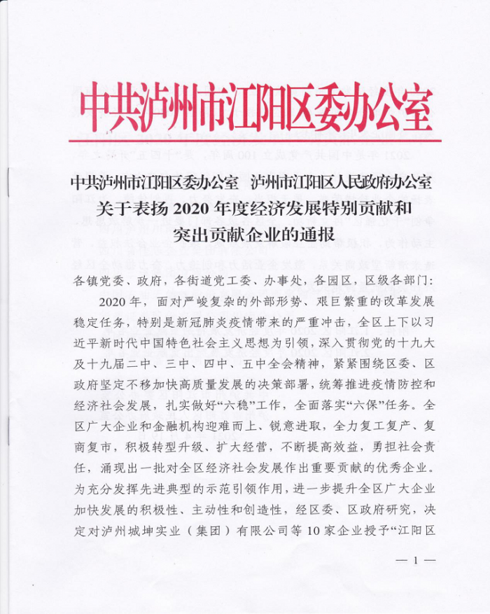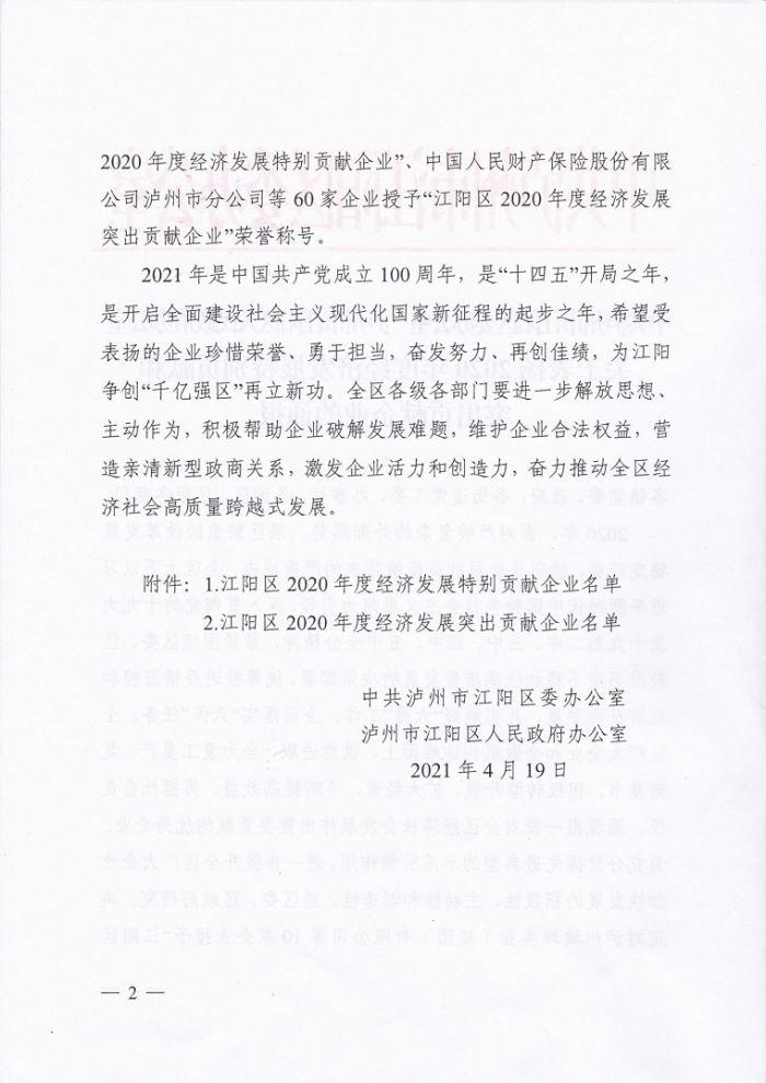 2021年4月20日上午,中共瀘州市江陽區(qū)委、瀘州市江陽區(qū)人民政府在江陽會議中心召開2021年區(qū)委經濟工作會議,會議隆重表彰了在2020年為江陽區(qū)經濟發(fā)展作出特別貢獻的優(yōu)秀企業(yè)10家,作出突出貢獻的優(yōu)秀企業(yè)60家,其中四川興順勞務代理有限公司再一次榜上有名,榮獲“瀘州市江陽區(qū)2020年度經濟發(fā)展突出貢獻獎”榮譽稱號。